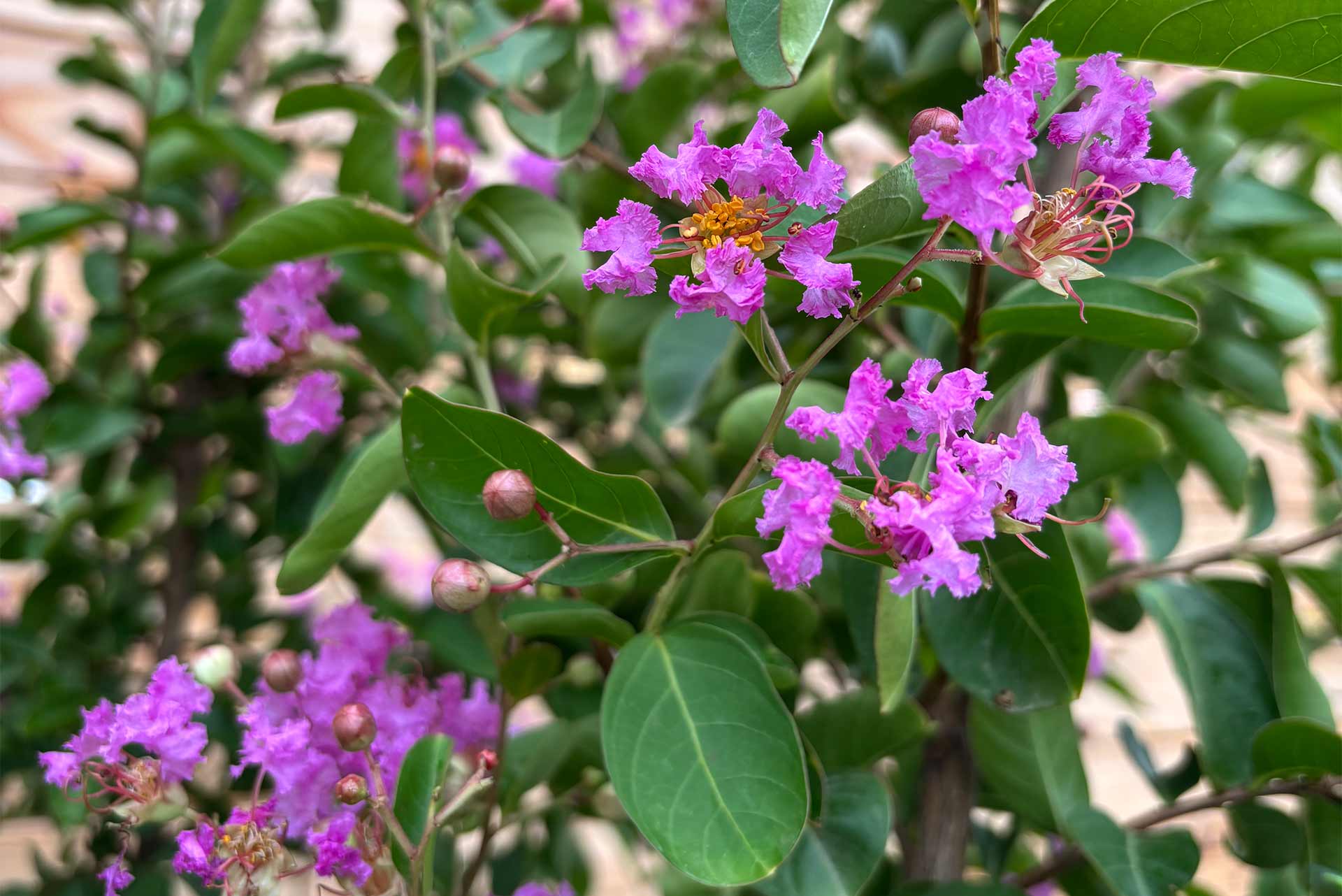 Die mehrstämmige Lagerströmie ist ein eleganter Blickfang mit leuchtenden Blüten und außergewöhnlicher Rindenstruktur.