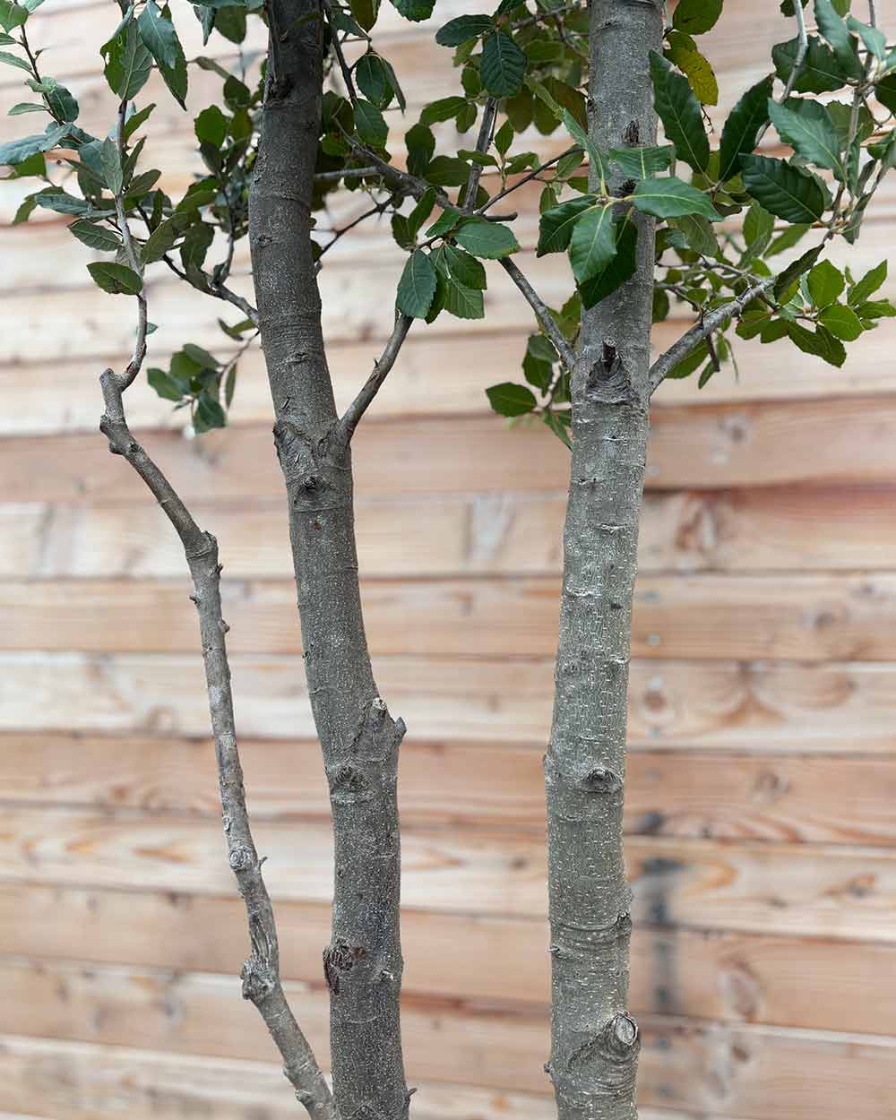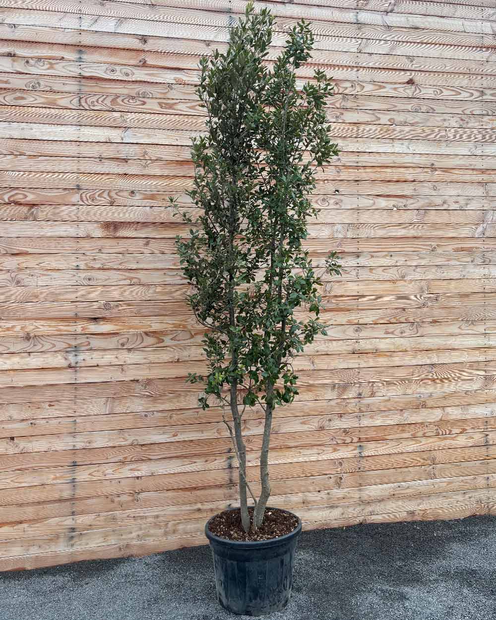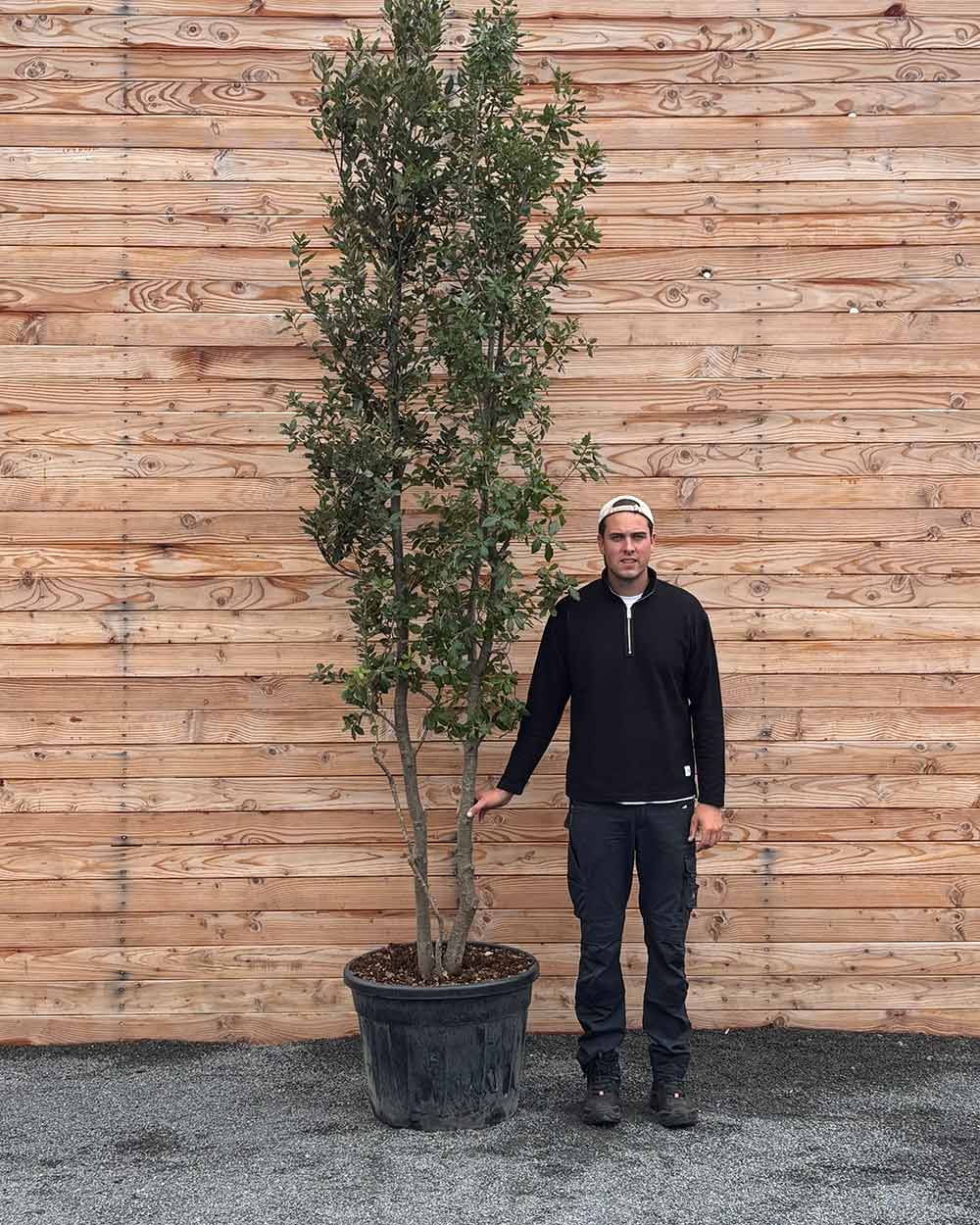 Die Steineiche „Quercus ilex“ ist ein immergrüner, mediterraner Baum mit dichtem, dunkelgrünem Laub und markanter, graubrauner Rinde. Ihr ledriges, leicht glänzendes Blattwerk bleibt ganzjährig attraktiv und sorgt für eine elegante, naturnahe Atmosphäre im Garten oder auf der Terrasse. Dank ihres kompakten Wuchses, der Schnittverträglichkeit und der robusten Natur eignet sich die Steineiche ideal als Spalierbaum für kleine Gärten, Terrassen oder als immergrüner Sichtschutz.