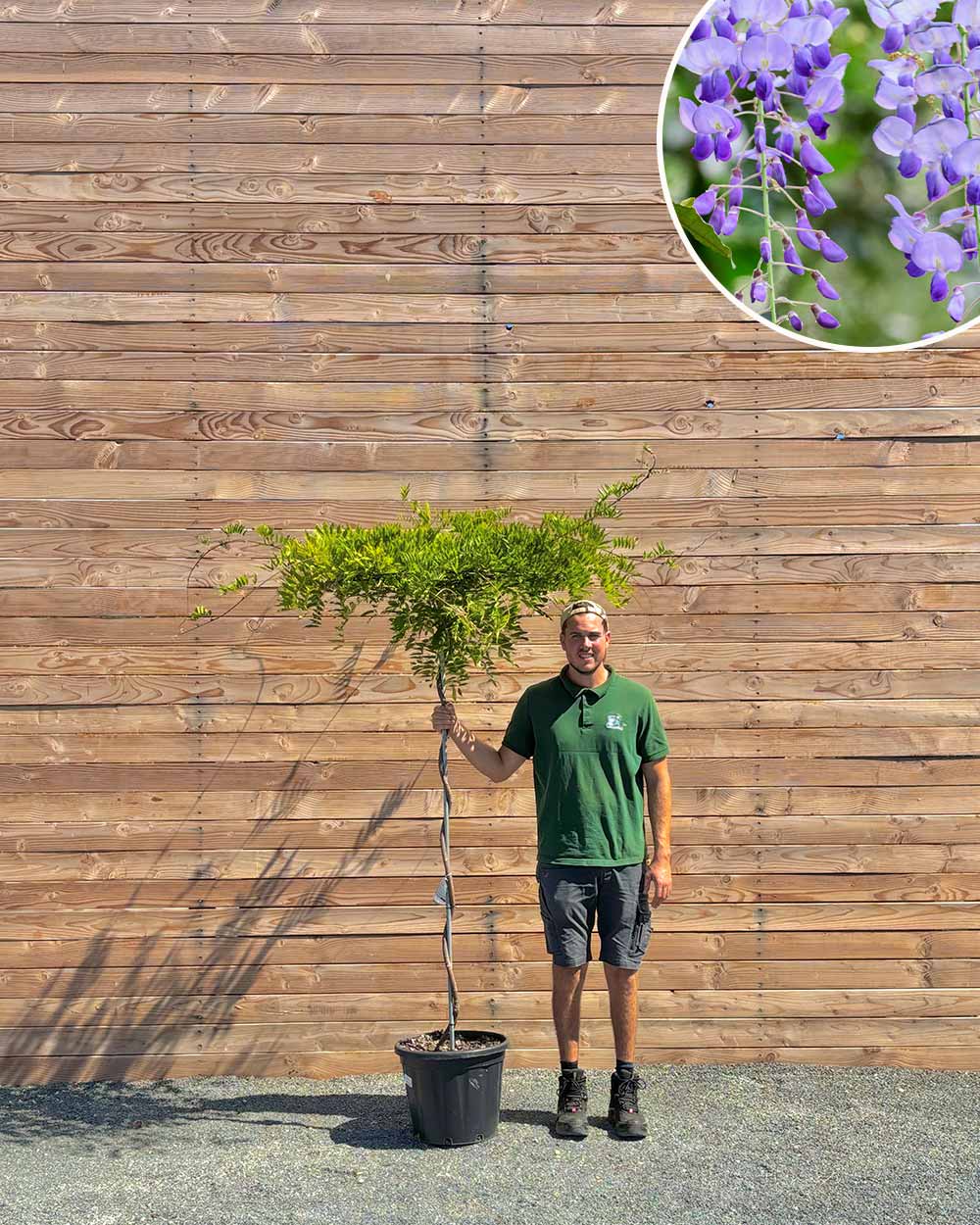 Der Japanische Blauregen „Wisteria floribunda Ato Koku Riu“ ist eine beeindruckende Kletterpflanze, die mit ihren langen, violett-blauen Blütentrauben im Frühling für einen spektakulären Anblick sorgt. Die duftenden Blüten hängen in bis zu 50 cm langen Trauben und verleihen jedem Garten einen romantischen, exotischen Charme. Diese Sorte ist winterhart und pflegeleicht und eignet sich perfekt zur Begrünung von Pergolen, Hauswänden und Spalieren. Der Blauregen wächst schnell und kann bis zu 8-10 Meter hoch werden, was ihn ideal für große Kletterflächen macht. Die „Wisteria floribunda Ato Koku Riu“ sorgt im Garten für ein einzigartiges Farbspiel und ist ein echter Blickfang in jedem Außenbereich.