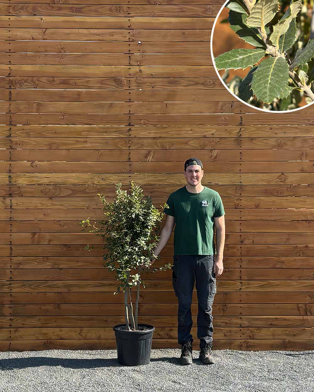 Die Steineiche beeindruckt mit immergrünem, dunkelglänzendem Laub und einem markanten, mehrstämmigen Wuchs. Sie ist besonders robust, trockenheitsverträglich und bringt mediterranes Flair in moderne wie klassische Gärten.